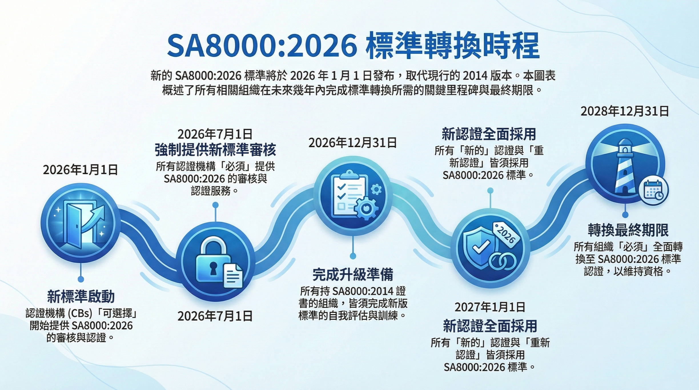下圖彙整了 SA8000:2026 標準轉版的五個關鍵時間點,幫助您快速掌握整體時程。